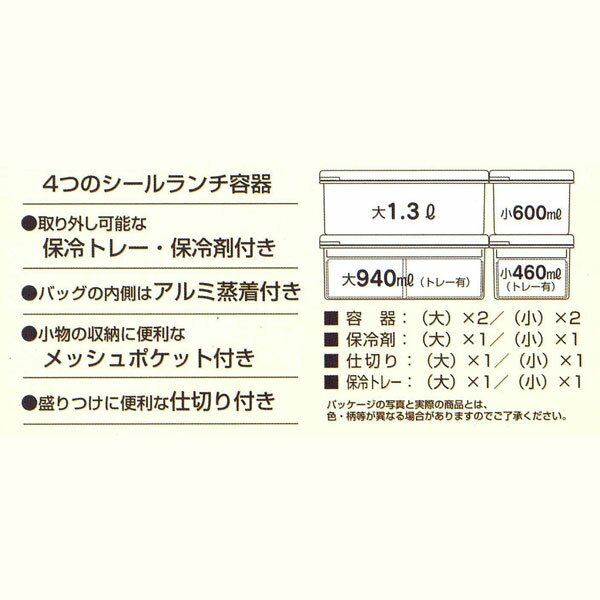 サイズ ランチバック 幅28.3x奥行18.5x高さ14cm(持ち手含まず) 弁当箱(大) 幅17x奥行17x高さ6.5cm 弁当箱(小) 幅17x奥行8.5x高さ6.5cm 実容量 (大)1.3L(トレー付940ml) (小)600ml(トレー付460ml) 材質 フタ:EVA樹脂 本体・仕切り・保冷トレー:ポリプロピレン セット内容 容器:(大)×2 (小)×2 保冷剤:(大)×1 (小)×1 仕切り:(大)×1 (小)×1 保冷トレー:(大)×1 (小)×1 保冷バッグ キーワード スヌーピー ファミリー 弁当箱 保冷バッグ 付き 行楽 ランチ セット ランチタイム ランチボックス ピクニック 保冷 レジャー 大容量 運動会 大型 お重 重箱 スケーター KCPC4 201706-02